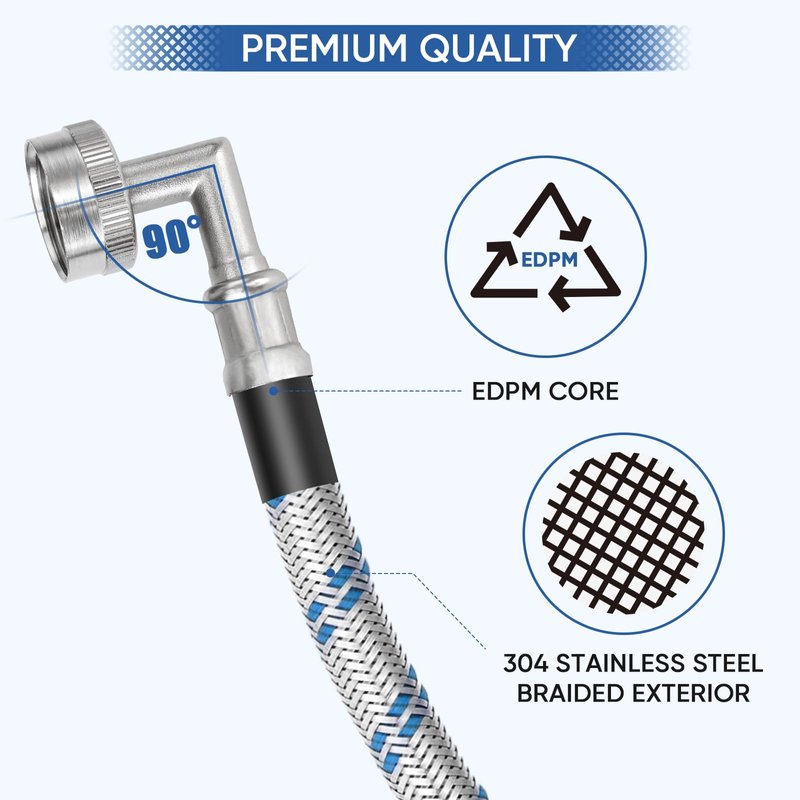 - [UNIVERSAL & EASY INSTALLATION] 3/4" FHT universal thread fits all major washing machine brands. Our stainless steel washer hose is easy to install, you can quickly and easily attach them to your washing machine and water supply. The right-angle 90 degree hose elbow can save space between your washing machine and the wall.