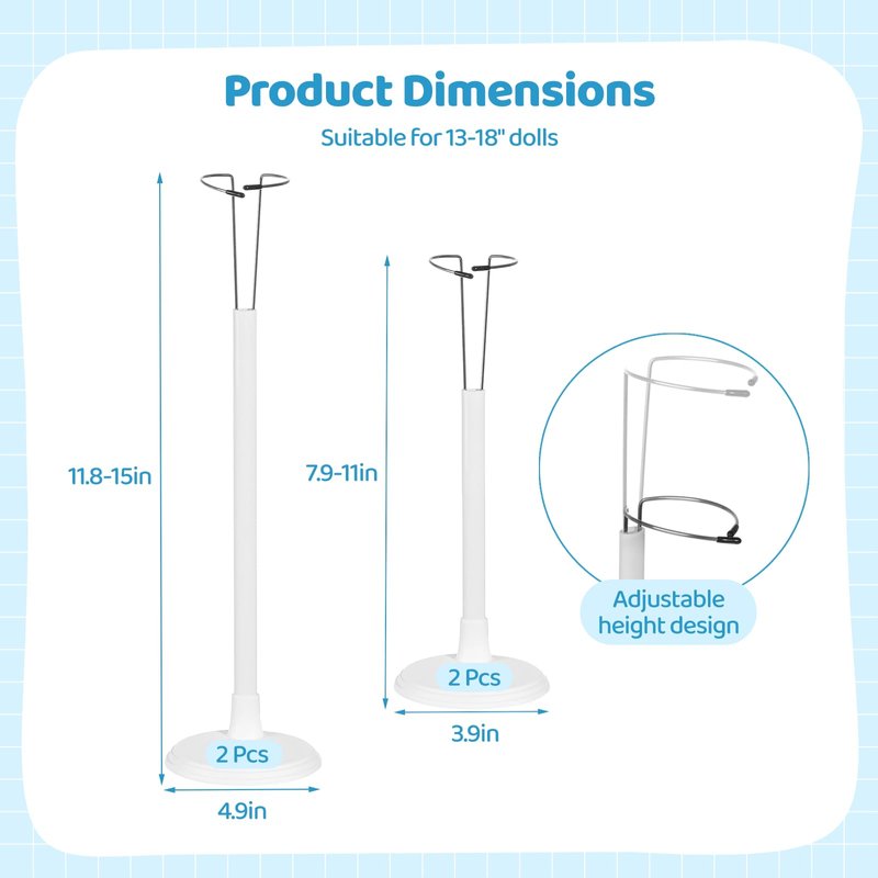 - 【Adjustable Height for 13-18" Dolls】With adjustable height design, the smaller stands have an adjustable range from 7.9 to 11" and the larger from 11.8 to 15", catering to 13-18" dolls. The large bases, with diameters of 3.9" and 4.9", offer stable support for dolls of different weights, preventing wobbling or tipping.