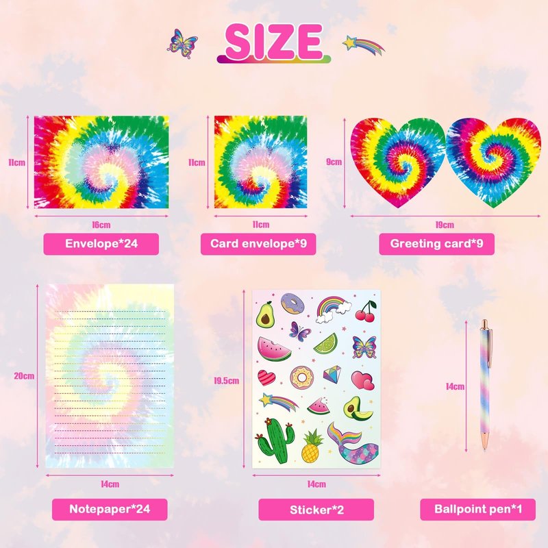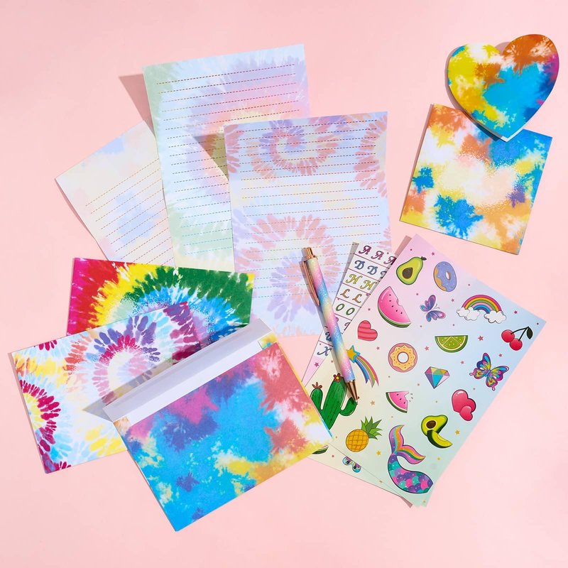 - MULTIFUNCTIONAL: Tie dye theme can inspire children’s creative inspiration. Kids can write tidy sentences on the lined writing papers with no worry. Cute stickers make the items come to life on the letters and cards