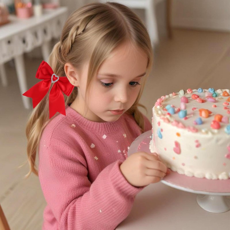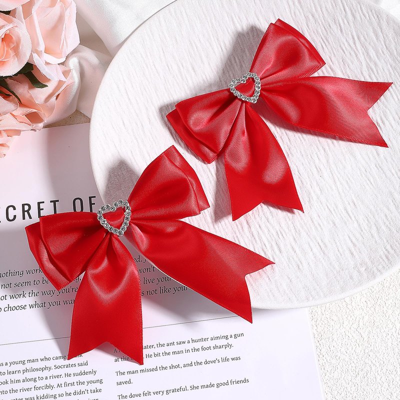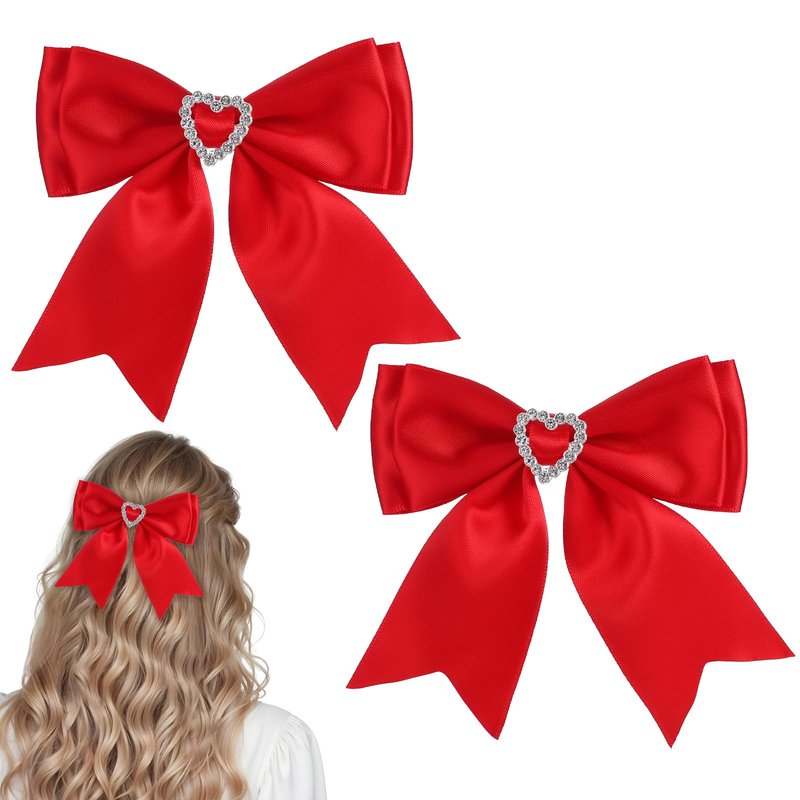 TIESOME Satin Bow Hair Clips, 2 PCS Bowknot Hair Clips Cute Sweet Heart Rhinestones Ribbon Hairpins Bow Hair Barrettes Christmas New Year Valentines Day Hair Accessories for Women (Red)
