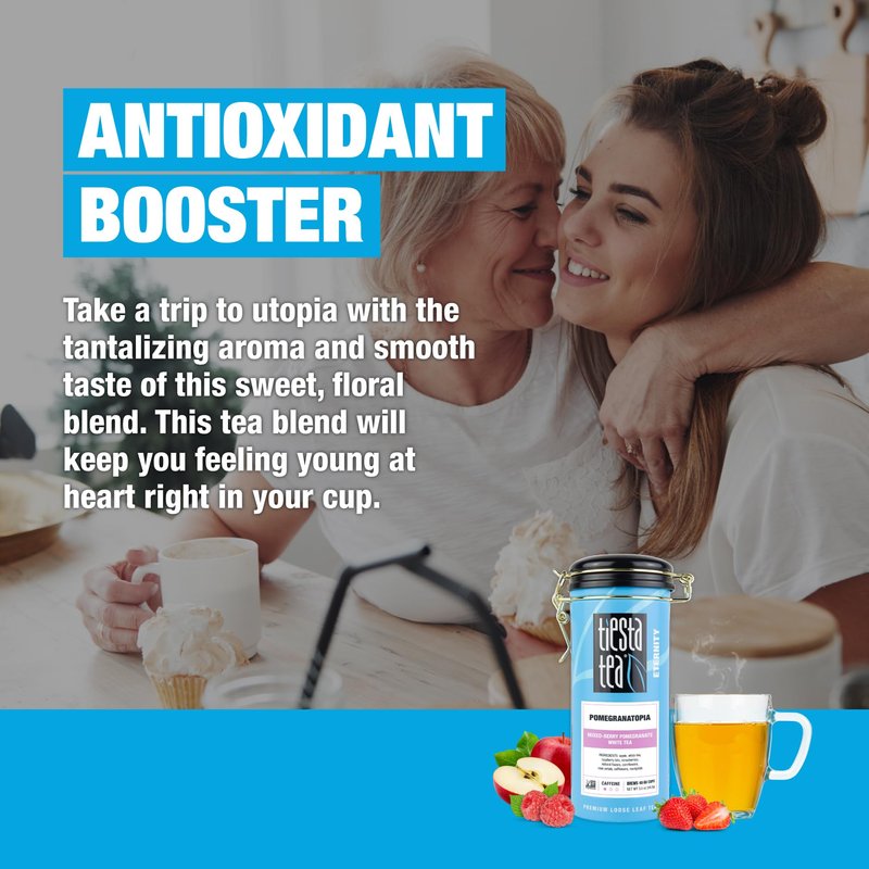 - MIXED-BERRY POMEGRANATE WHITE TEA: Dive into the delightful taste of Pomegranatopia. This loose leaf tea blend enchants with the tart-sweetness of pomegranate paired with a medley of fruity flavors. It's a colorful, joy-filled experience that brings a burst of cheer to your day.