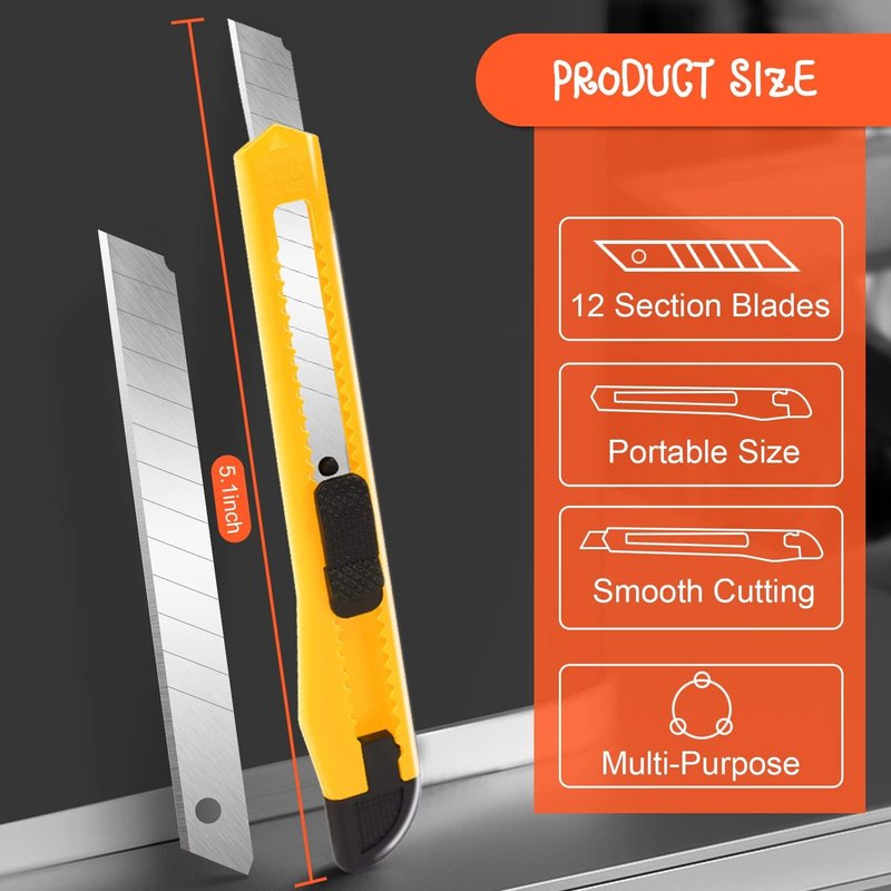 - Light-Weight & Portable: Weighing in at 9.8 grams and available in 4 PCS, it's easy to carry anywhere, whether it's crafting, cutting boxes or daily use. Perfect for those who value efficiency and convenience, as the blade can be easily broken into 12 sections, ensuring a sharp cutting edge at all times, making it a cost-effective option compared to other utility knives.