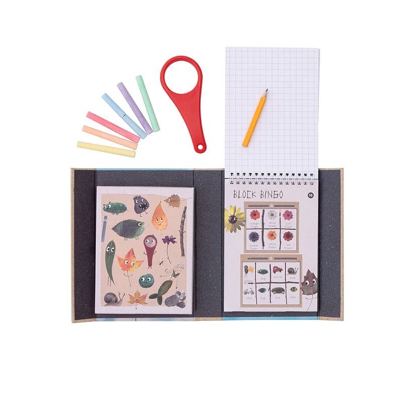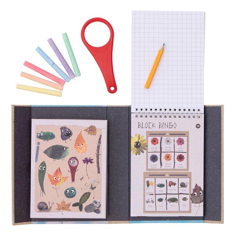 - SET INCLUDES: 1x magnifying glass, 6x colored chalk, HB Pencil, 36 page outdoor activity book, Handy storage box.