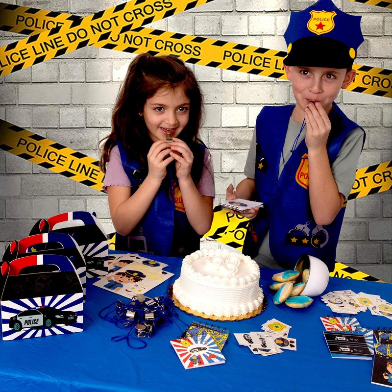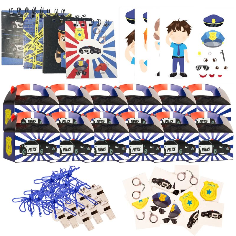 - This police party favors for kids set is for 12 children - includes 12 party favor boxes, 12 notepads, 12 whistles, 12 make-a-face stickers and 144 tattoos! These party sets are an adorable addition to any police themed party!