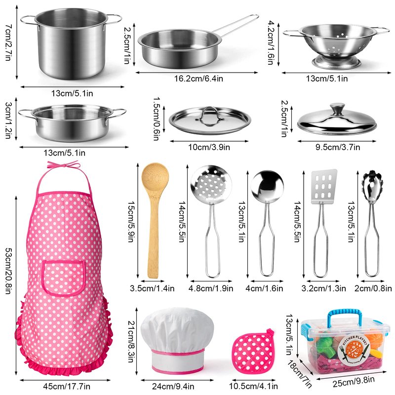 - KIDS KITCHEN TOYS SET: 26 pieces in total, include 4 stainless steel pots and pans set(a colander, pot holder,stainless steel pots and pans with Lid and Handles), a Wooden Utensils, Apron & Chef Hat and pretend food cutting vegetable toys. Perfect for kids pretend play and role play.