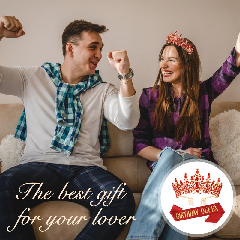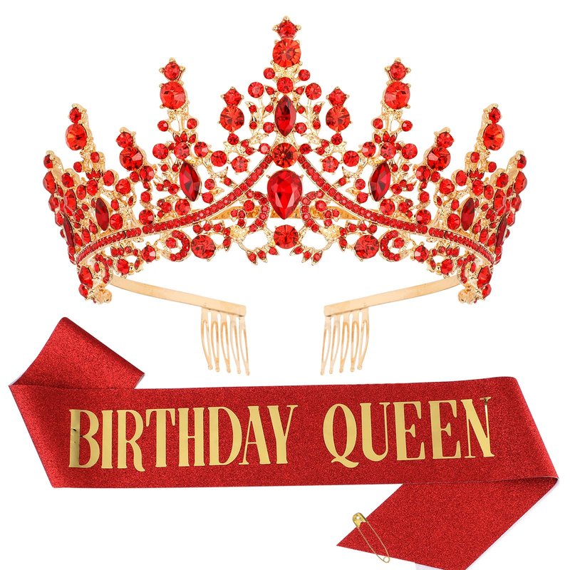 Tihebax Birthday Queen Sash & Rhinestone Tiara Red Gold Crown Birthday Sash and Tiara for Women Girls Princess Tiara Crown Birthday Accessories Glitter Birthday Sash Birthday Party Favors