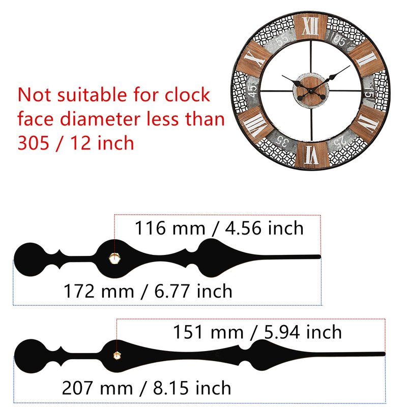 - Measurement: hand length: total hour hand length: approx. 172 mm (6.8 inches); Total minute hand length: approx. 207 mm (8.1 inches); Second caps: approx. 7 mm (0.3 inch).