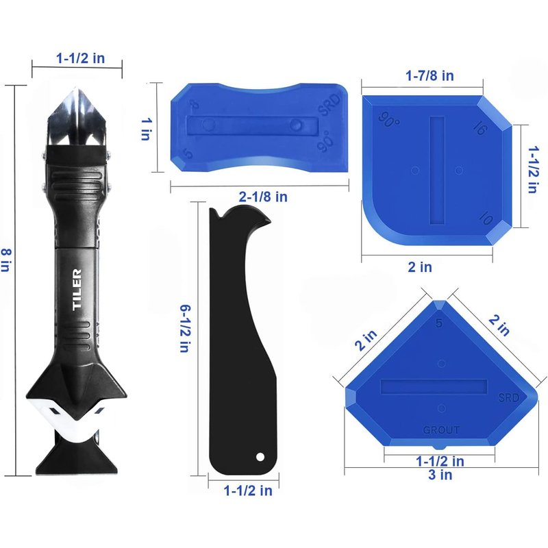 - 👍PERFECT SILICONE CAULKING TOOL: TILER 5-in-1 Silicone Caulking Tool remove the seal and re-sealing and clean the residual glue quickly, and repair the gap effectively. It improves the agglutinating quality and promises an aesthetic sense of the surface.