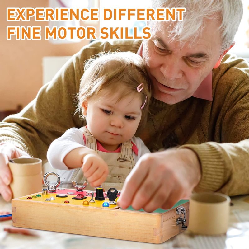 - 2-in-1 Busy Board: A great combination of screwdriver board and light switch toy, providing them with endless opportunities to learn and play. With 10 kinds of screws, 6 different kinds of switches, and 6 colors of light beads, kids can develop their color perception and fine motor skills in fun and engaging ways