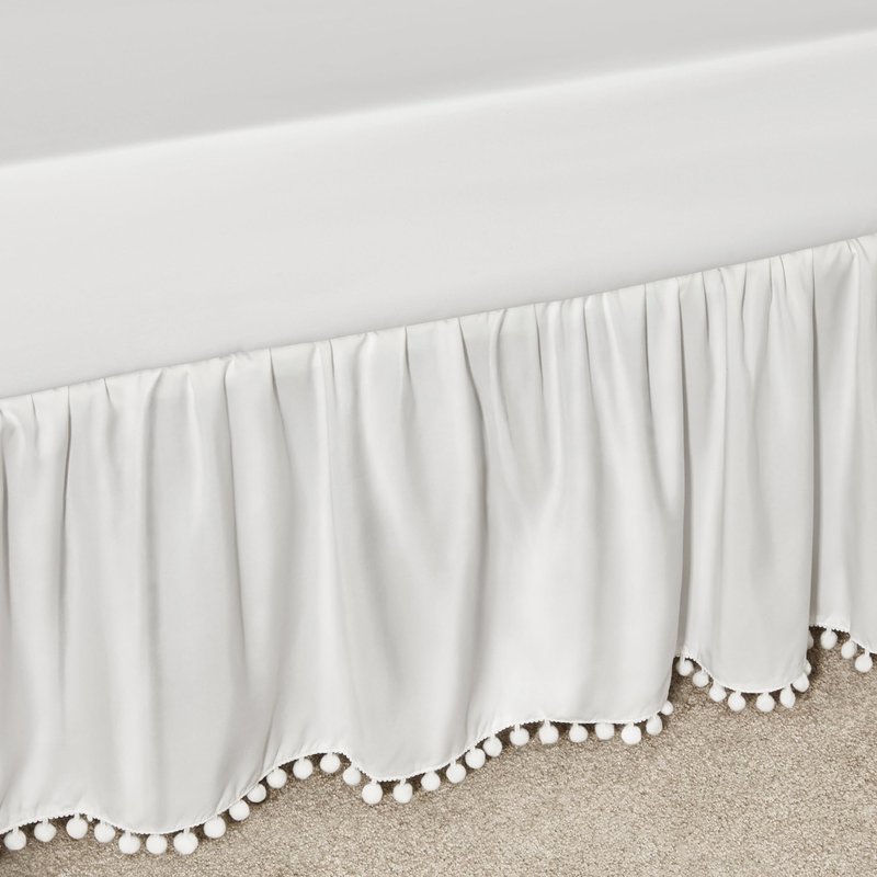 TILLYOU Ruffled Crib Skirt with Pompoms, Microfiber Nursery Crib Toddler Bedding Skirts for Baby Boys Girls, 14'' Drop, White