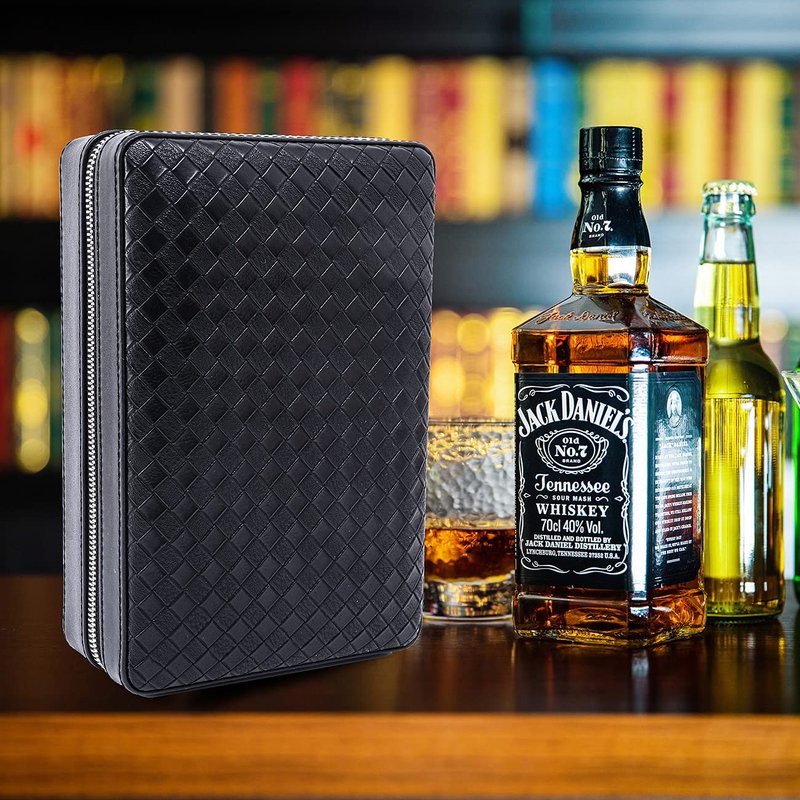 Time C Club 4-Finger Portable Black Weave Texture Travel Leather Cigar Case, Cigar Cutter, Cigar Humidor with and Humidifier, Groomsmen Gift, Birthday Gift