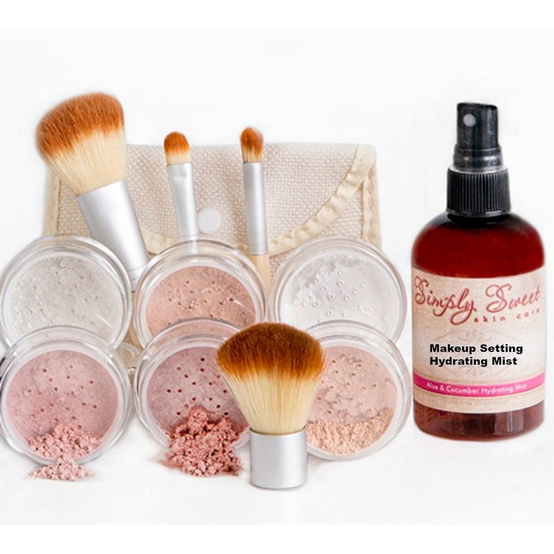 This Kit Includes: 6 Full Size Jars of Mineral Makeup: Foundation, Concealer, Bronzer, Sweet Cheeks Blush, Veil Primer Powder and Finishing Powder These are 20 gram sifter jars that are filled to capacity with 9 grams of powder inside each one. 1 Hydrating Mist and Makeup Setting Spray: Use this amazing Hydrating Mist to set your makeup in place or use as a facial pick-me-up throughout the day. Our Hydrating Mist smells so fresh and feels so refreshing on the skin. Hydrating the skin is very important and our Aloe and Cucumber Hydrating Mist is perfect for every skin type. This is a full 4 oz bottle. 1 Lip & Eye Primer: When it tingles a little, you know it's working and plumping the skin. 1 oz. 1 Pore Miracle Primer Base. This is luxurious. silky and mattifying for all skin types. Make sure to apply this before your minerals for a soft, flawless appearance. 1 fluid oz. 1 four piece Vegan Bamboo Brush set. 1 Storage Pouch for Brushes. 1 Makeup Case: This spacious pouch is water resistant. It wipes clean and is the perfect solution for storing everything in this kit. Pink color of makeup case may vary depending on stock.Made in the USA Animal Cruelty FreeAll Natural