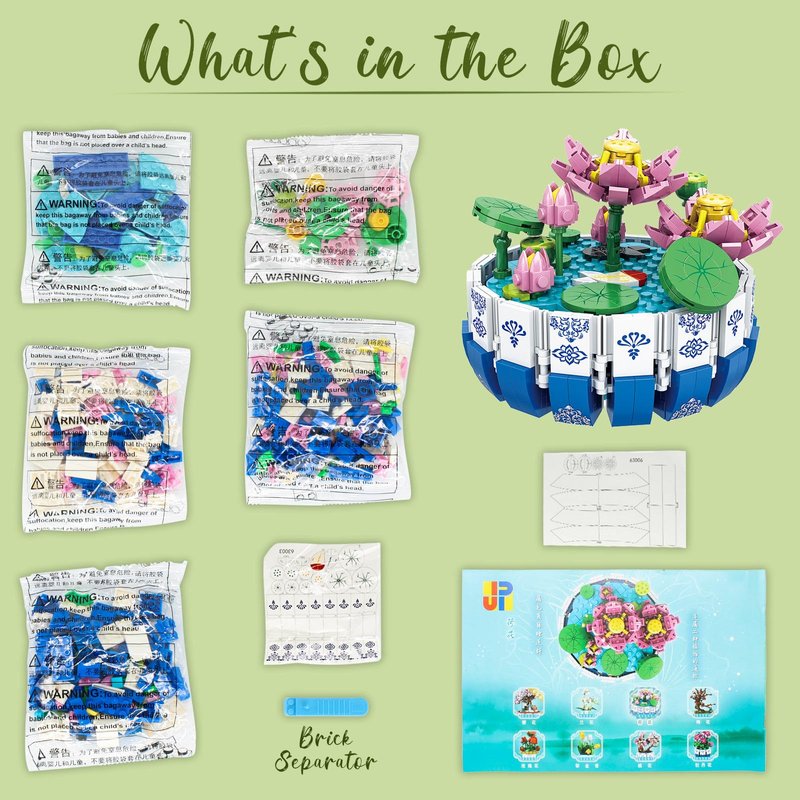 - Elegant Lotus-Inspired Design: The blocks are crafted in the likeness of miniature lotus plants, featuring graceful lines and a lifelike appearance. Whether used as home decor or added to a figurine collection, they hold a special significance.