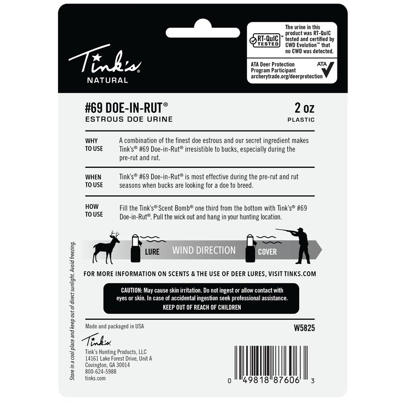 - INCLUDES: Tink’s 2 Ounce #69 Doe-In-Rut Buck Lure Bottle & 1 Ounce Scent Bomb