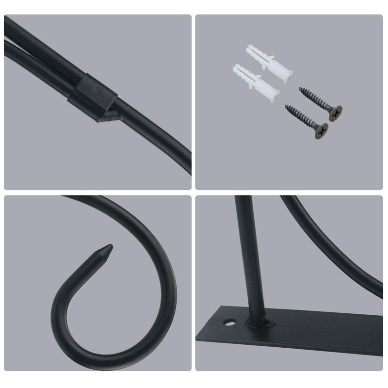 Straight down curled bracket hook, Black varnish, Rustproof, which suitable to use in patio, garden, backyard wooden fence or indoor wall, adding elegance and beauty to your home or garden. Triangular structure design with superior load bearing and stability can hang your heavy duty items. Perfect for hanging wind chimes, flower baskets, decorative plants,lantern, wind spinners, bird feeders. Specification: Feature:Straight down curled Material: IronColor:Black Size:10.6 x 6.1 inches(L X H) Package Quantity: 1× Iron bracket hook with screws