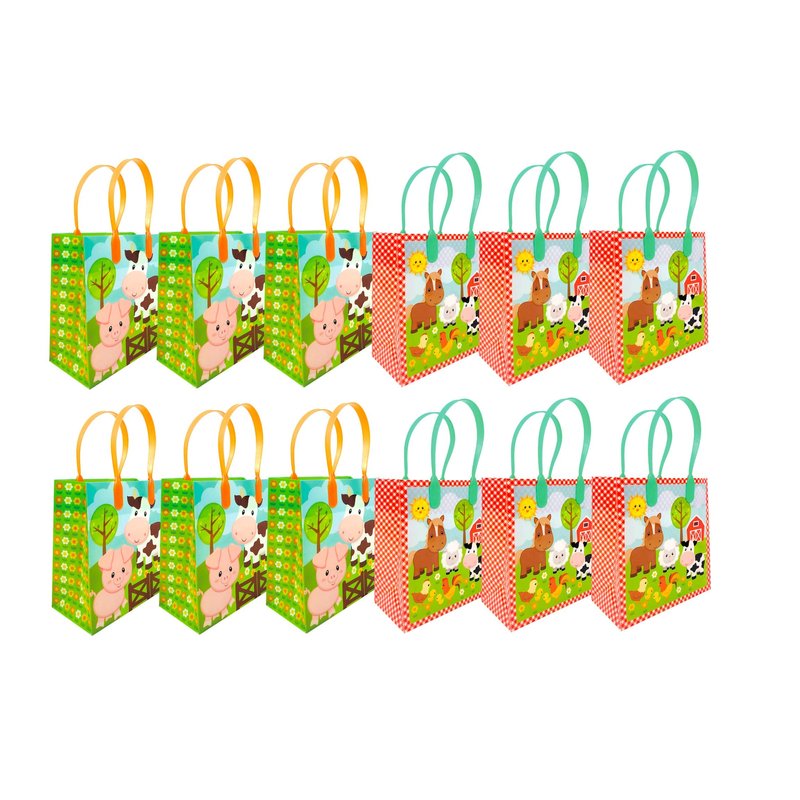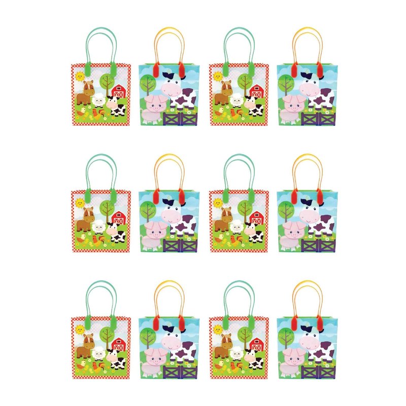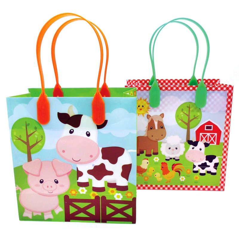 - 12 assorted plastic RESUABLE gift bags in a colorful print such as cow, horse, pig, red barnyard, and other cute farm animals!