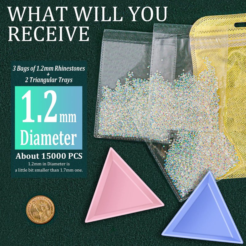- WHAT YOU WILL RECEIVE:15000Pcs 1.2mm Ultra Mini Pixie Crystal Iridescent AB Rhinestones(Total 3 Bags, 5000Pcs Each Bag), 2Pcs Triangular Plastic Sorting Trays. Beads with AB Coating Act Like a Mirror While Reflecting a Color of Rainbow, Which Is Made of High Quality Glass. 2Pcs Triangular Plastic Trays Are Used to Hold the Mini Rhinestones to Avoid Spilling All Over And Put the Rest Crystals Into the Bags Expedientl