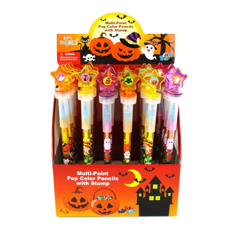 - 24 assorted Halloween themed stacking crayon pack comes with a display box. These bulk Halloween party favors are great handouts! Each crayon contains different colored leads, red, blue, yellow, orange, green, purple, pink, black, dark blue. Kids cam change out the colors in one crayon! So convenient and easy. Plus each stacking crayon has a self-inking stamp on top so kids can be more creative with their drawings and decorations! Kids can draw and stamp with the same stacking crayon!