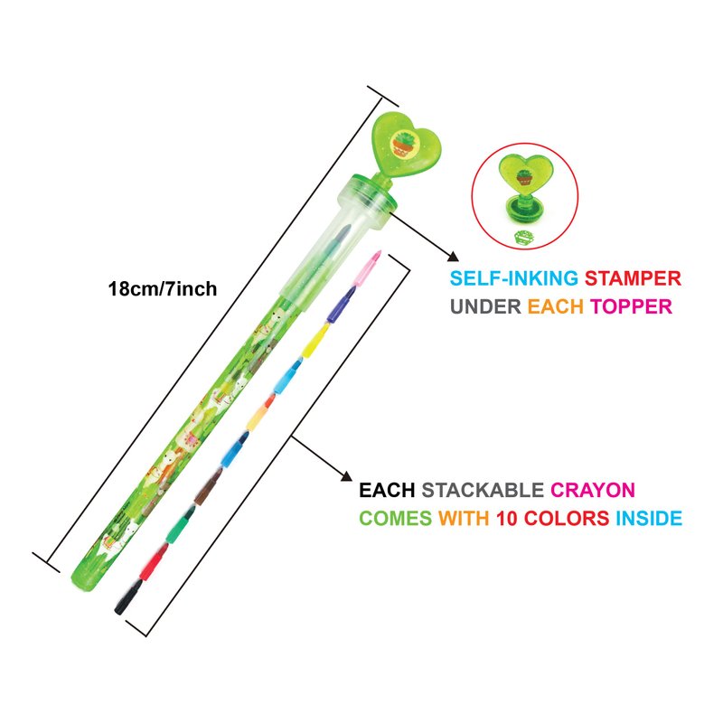 - 24 llamas stacking crayon pack comes with a display box. Each crayon contains different colored leads, red, blue, yellow, orange, green, purple, pink, black, dark blue. Kids cam change out the colors in one crayon! So convenient and easy. Plus each stacking crayon has a self-inking stamp on top so kids can be more creative with their drawings and decorations! Kids can draw and stamp with the same stacking crayon!