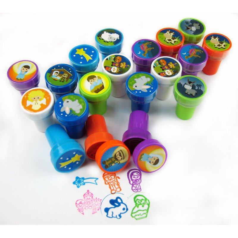 - 24 religious nativity themed stampers in each assortment! Stamps are BPA free, non-toxic and passed CPSIA and ASTM testing. Approx. stamper size: 1.5 inches tall, 1 inch in diameter