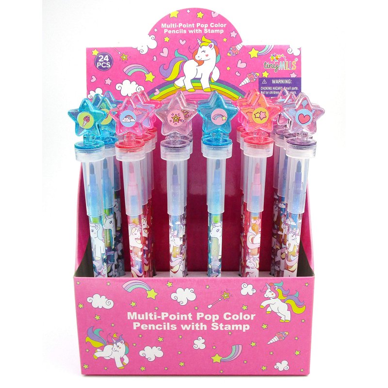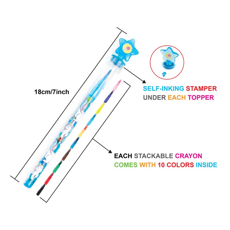 - 24 unicorn rainbow stacking crayon pack comes with a display box. Each crayon contains different colored leads, red, blue, yellow, orange, green, purple, pink, black, dark blue. Kids cam change out the colors in one crayon! So convenient and easy. Plus each stacking crayon has a self-inking stamp on top so kids can be more creative with their drawings and decorations! Kids can draw and stamp with the same stacking crayon!