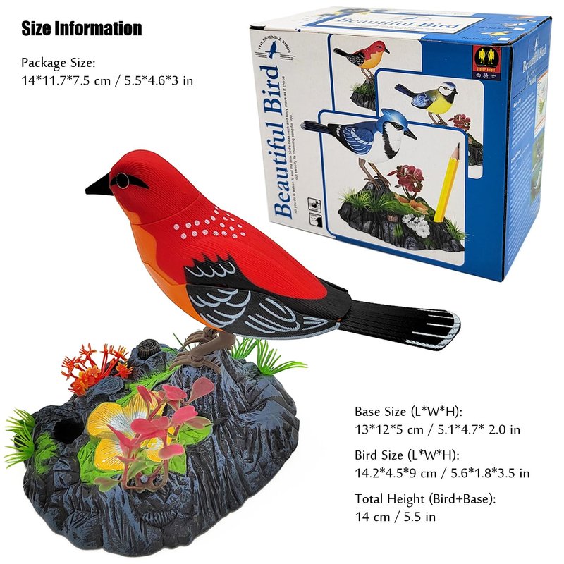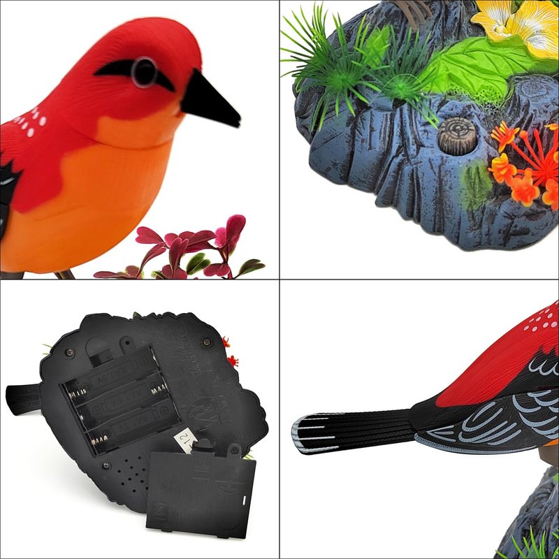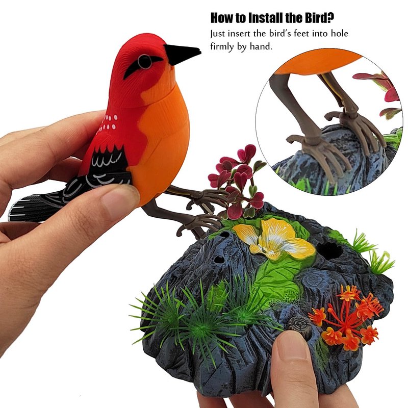 - 【Realistic Bird】 Lifelike bird shape, vivid colors, high simulation rocks and plants, fine workmanship, just like a real bird rest on the rock. While the bird chirps, its heads will swing side to side, the mouth will keep opening and closing, the wings will flap and the body will swing back and forth.
