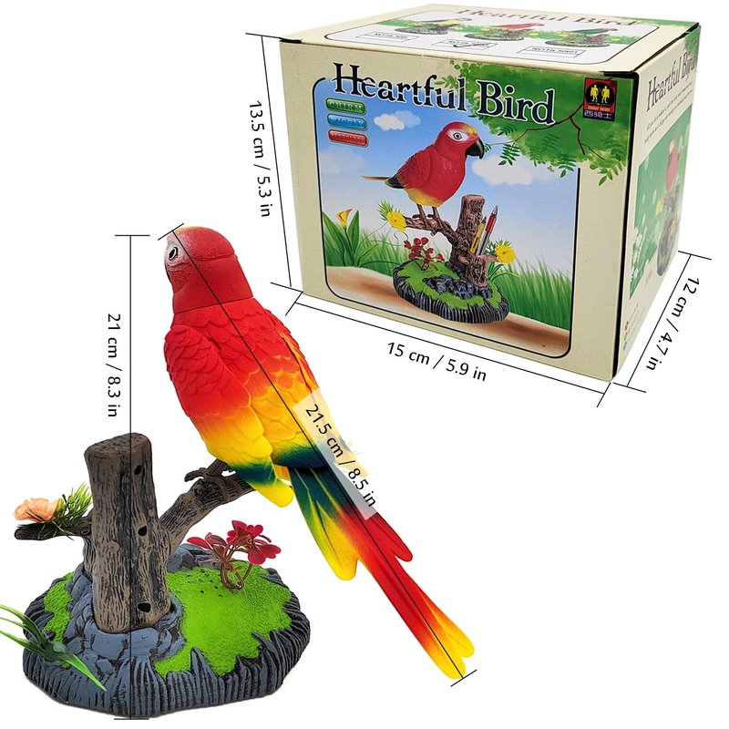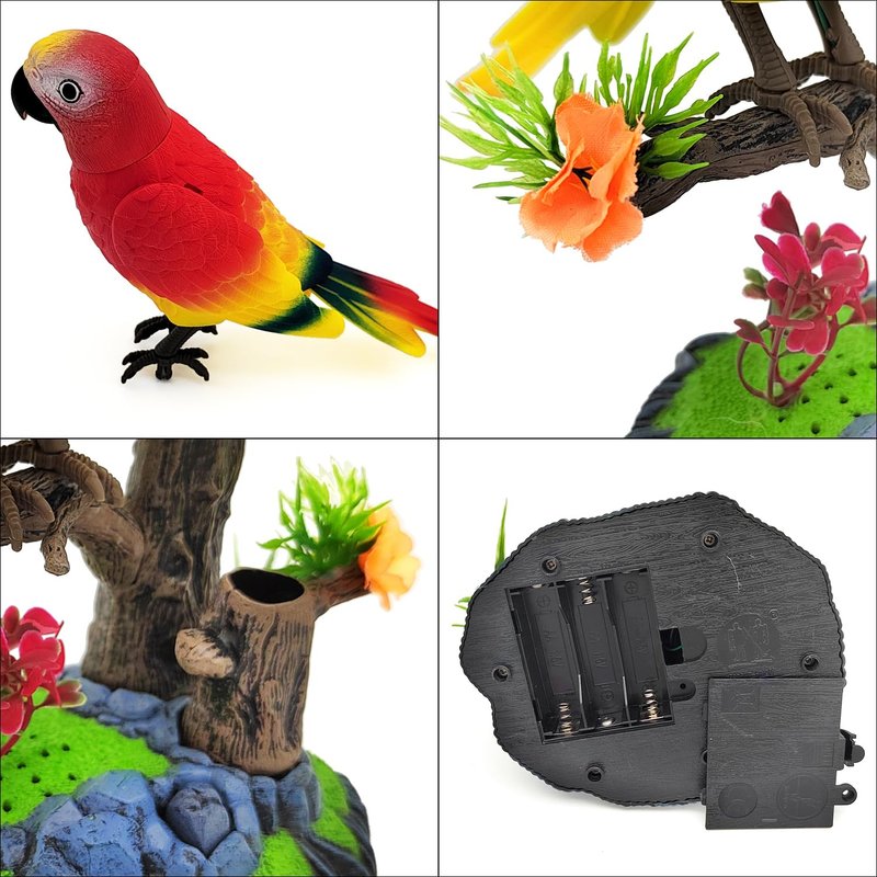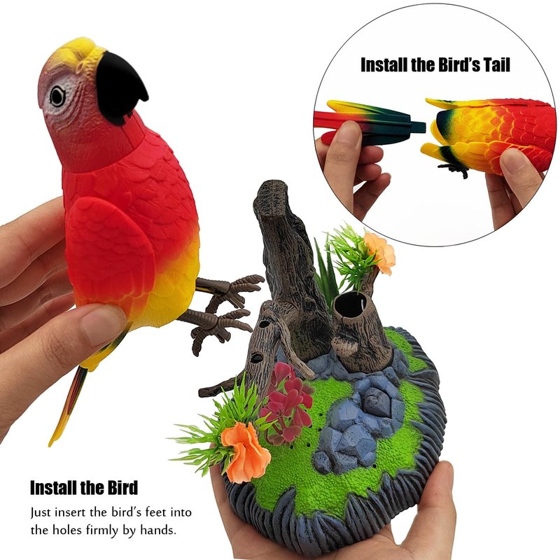- 【Realistic Bird】 Lifelike bird shape, vivid colors, fine workmanship, just like a real parrot rest on the branch. While the bird chirps, its heads will swing side to side, the mouth will keep opening and closing, the wings will flap and the body will swing back and forth.
