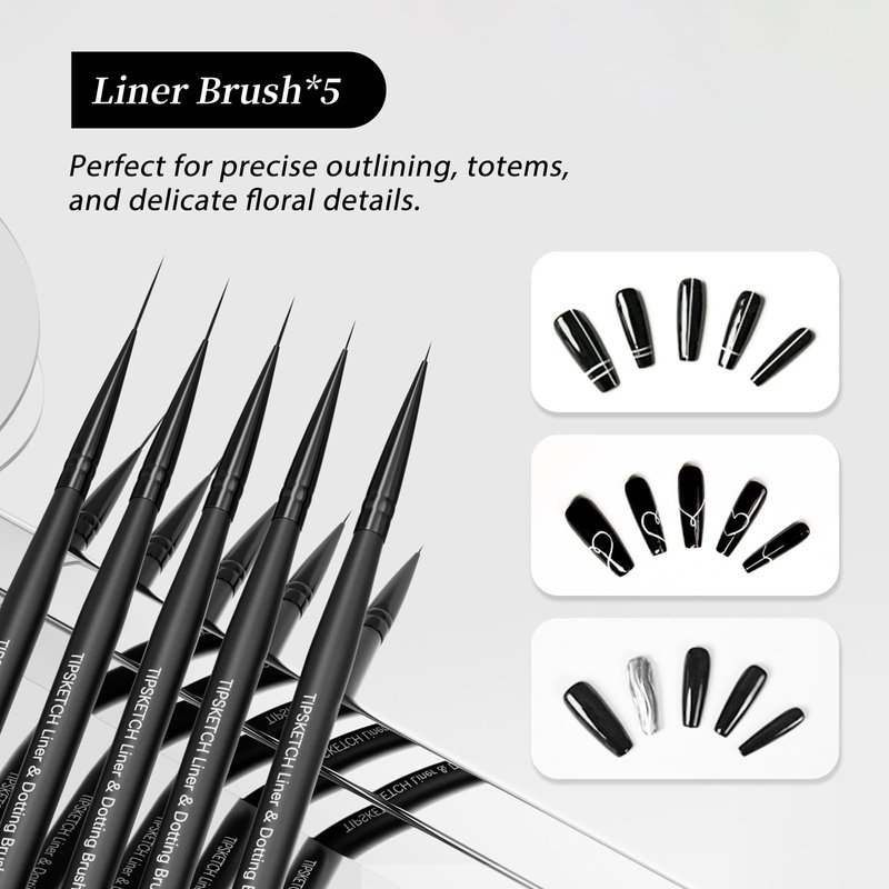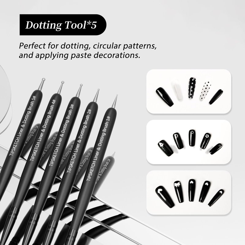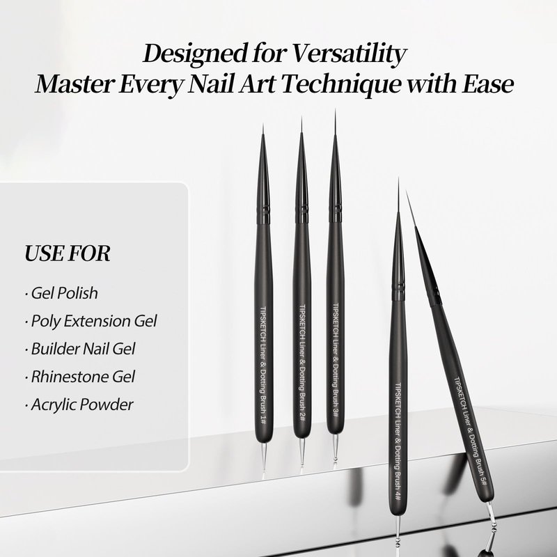 Introducing the Tipsketch Nail Art Brush Set, an essential tool for anyone passionate about nail art. This set includes 5 dual-ended brushes, combining liner brushes and dotting tools in various sizes, crafted with premium Japanese fibers. The durable and corrosion-resistant design ensures that these brushes withstand frequent use and cleaning, making them perfect for working with a variety of mediums. The secure copper ferrules keep the bristles firmly in place, offering precision and ease for every stroke. Ideal for creating detailed and personalized nail art, this set caters to all skill levels.