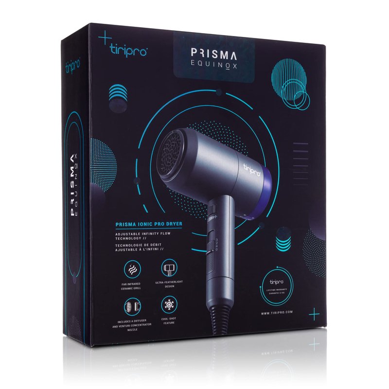 The next-generation Prisma Ionic Dryer from Tiripro is expertly crafted with a variety of features for you to experience the pinnacle performance of blow drying. Engineered with adjustable airflow Infinity Flow Technology and an advanced Far Infrared ceramic heater, this blow dryer uniquely allows you to control airflow - for futuristic functionality and effortless styling results. Negative ions generated by the Prisma dryer repair hair during the drying process by quickly breaking down water molecules - this allows hair to dry up to 60% faster than other typical hair dryers! Crushed Tourmaline gemstone elements and Ionic Technology work together in unison to deliver greatly reduced static & frizz, while simultaneously adding body, volume and shine. The impossibly light and exquisitely crafted Prisma dryer is the ultimate innovation in beauty technology and professional performance.