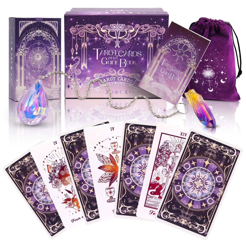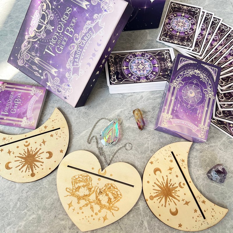 - ✦78 TAROT CARDS SET -- You will get: 78 tarot deck(22 Major Arcana and 46 Minor Arcana), a detailed tarot guidebook, 1 Heart Shape Wooden tarot card holder, 2 Moon Shape Wooden tarot card holders, a velvet tarot bag, a tarot card box, Chakra crystal stones. The unique wooden tarot card holder and crystal stones help you perform divination rituals and gather natural energy.