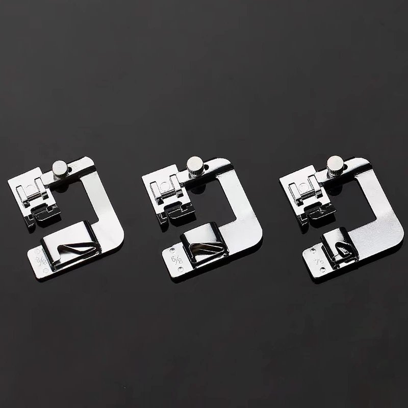 - 3 Sizes: 4/8" hemmer foot (13mm wide rolled hems), 6/8" hemmer foot (19mm wide rolled hems), 8/8" hemmer foot (25mm wide rolled hems).