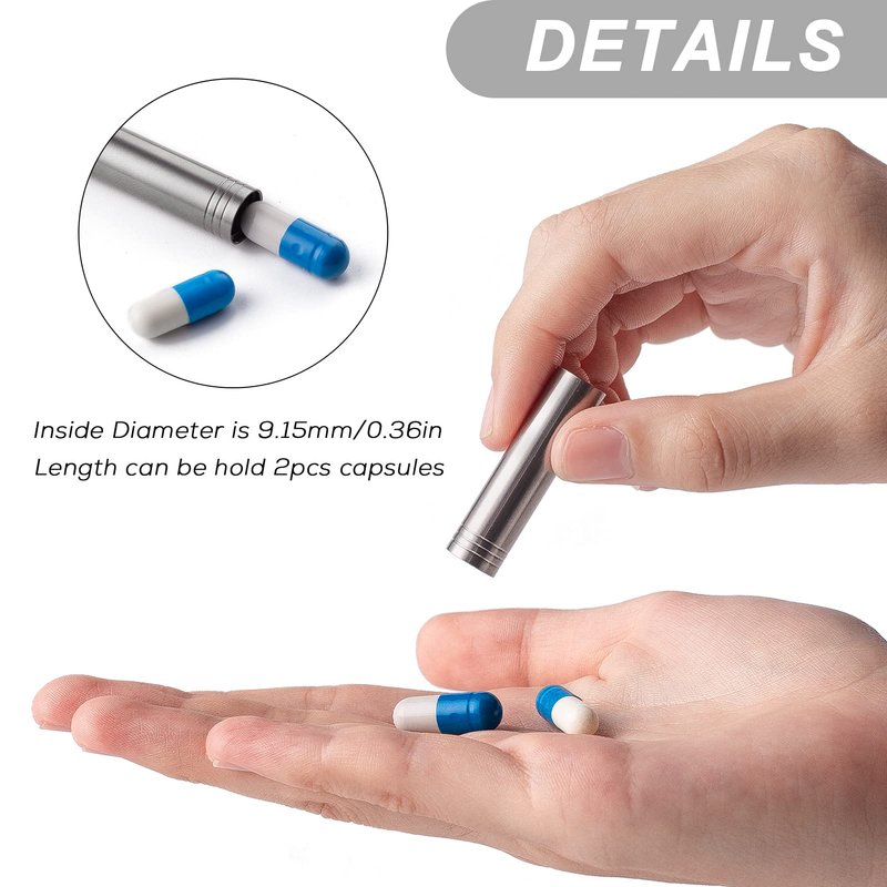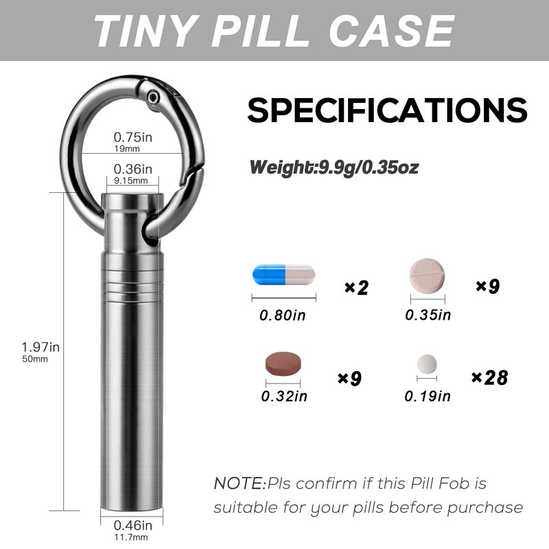 - Tiny Pill Holder:This Pocket Pill Box Keychain Weight 0.47oz (12.3g)/Inner Diameter: 7mm (0.27 Inch)/Inner Length: 32mm (1.28 Inch). Pls Confirm If This Pill Fob Is Suitable For Your Pills Before Purchase.