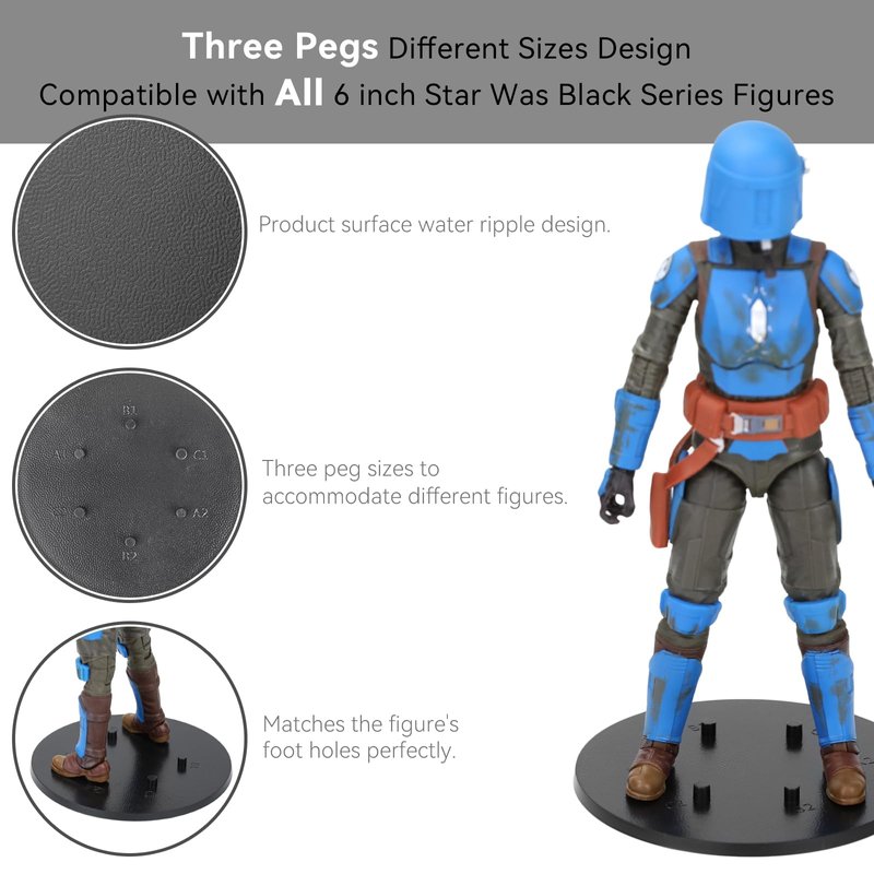 - ATTENTION TO SIZE: The diameter of each figure display stand is 75 mm / 2.95 inch. It is available in multiple nail sizes, namely peg A1 matching peg A2: 3.0mm/ 0.12inch; peg B1 matching peg B2: 3.25mm/ 0.13inch; peg C1 matching peg C2: 3.6mm/ 0.14inch. Fit for Most 6 inch Star Was Black Series action figure Toy. Please confirm the size before buying, otherwise it will not be the right size for your action figure..