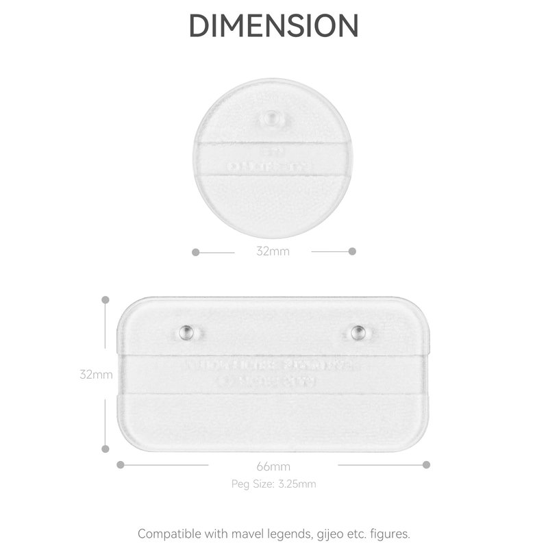 - ATTENTION TO SIZE: Each stand has 3.35 mm / 0.13 inch Peg. Square stand size: Length approx. 66 mm / 2.6 inch, Width approx. 32 mm / 1.3 inch. Round stand size: the diameter is 32 mm / 1.3 inch. Fit for Most 6 inch Mavel Legends Series/Gi Jeo Classified Series/D C/Mo tu figure Toy. Please confirm the size before buying, otherwise it will not be the right size for your action figure.