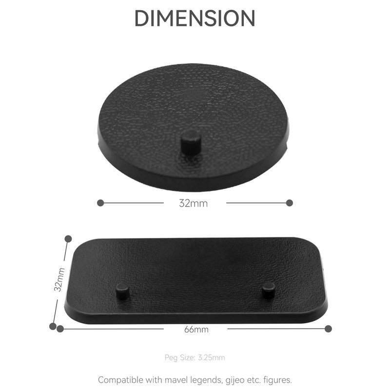 - ATTENTION TO SIZE: Each stand has 3.35 mm / 0.13 inch Peg. Square stand size: Length approx. 66 mm / 2.6 inch, Width approx. 32 mm / 1.3 inch. Round stand size: the diameter is 32 mm / 1.3 inch. Fit for Most 6 inch Mavel Legends Series/Gi Jeo Classified Series/D C/Mo tu figure Toy. Please confirm the size before buying, otherwise it will not be the right size for your action figure.