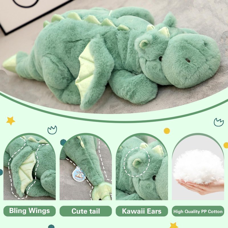 - Soft Dinosaurs Plush Toys: Dinosaur plushies pillow doll is designed shiny wings to make it more lovely and dreamy. Dinosaur plushies is so cute when lying down here. You will love this cute dinosaur toy