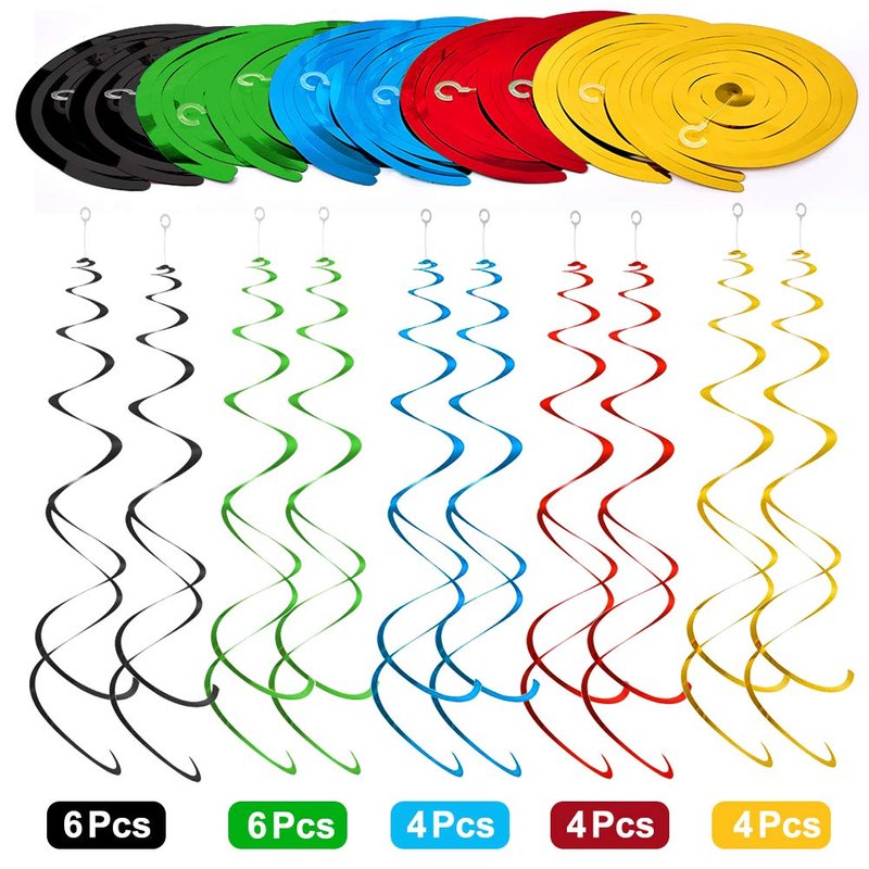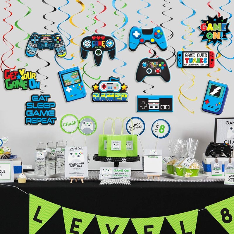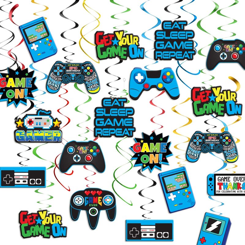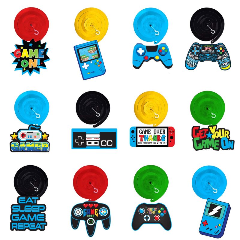 - Gamer Birthday Party Supplies:Package include 24 Foil Swirl Video Game Decorations with 24 Cutouts + 24 Double Spiral Video Game Decorations Without Cutouts,total 48 hanging swirls per package.