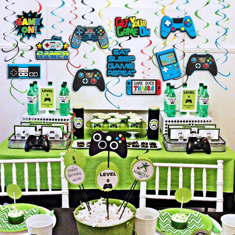 - Hanging the video game swirls from the ceiling, window, mantel, overhangs, doorway, archway, branches in trees or outdoor events. Video game theme party decorations are made of plastic and durable paper stock. These Video game hanging swirls are durable enough to be used many times in different party occasions.
