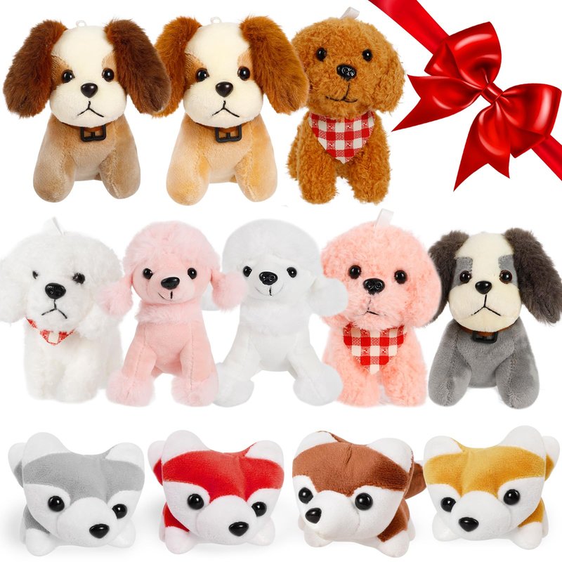 - Great buy! You get 12 plush puppies in 5 different styles! These adorable stuffed animals come in a variety of colors and breeds that your kids will love and go crazy for