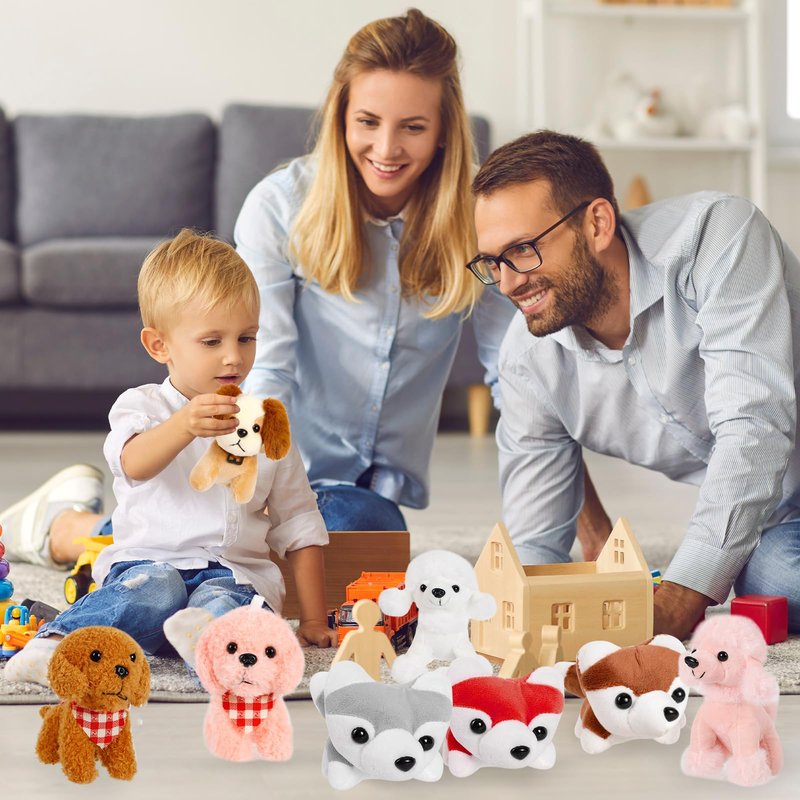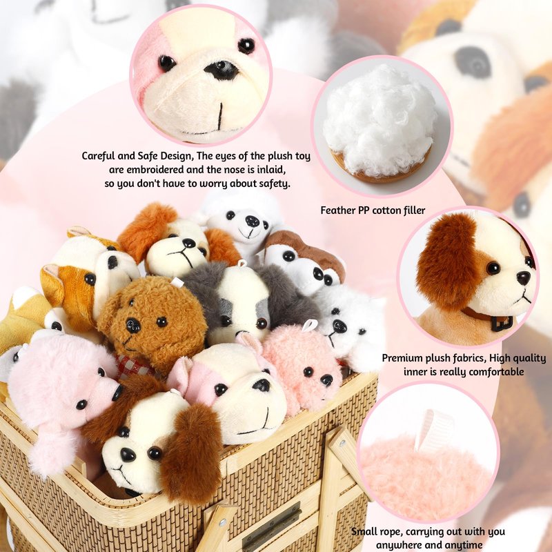 A set of 12 adorable plush puppy dogs in various breeds and colors. These cute little dogs are made of soft, huggable, and squeezable material, perfect for everyday play. With their extra cuteness and standing at 4.8 inches tall, they come in 5 different styles for added variety. It's a delightful collection that kids will absolutely love!