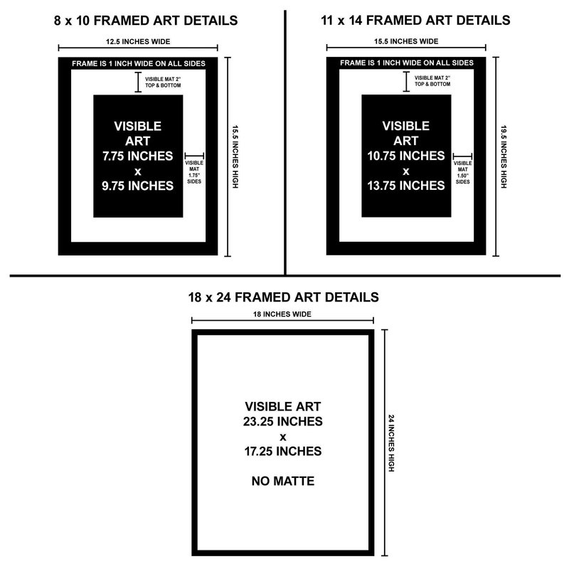 - Fine Art Print available plain paper, laminated or framed in three sizes: "8 x 10," "11 x 14" and "18 x 24."