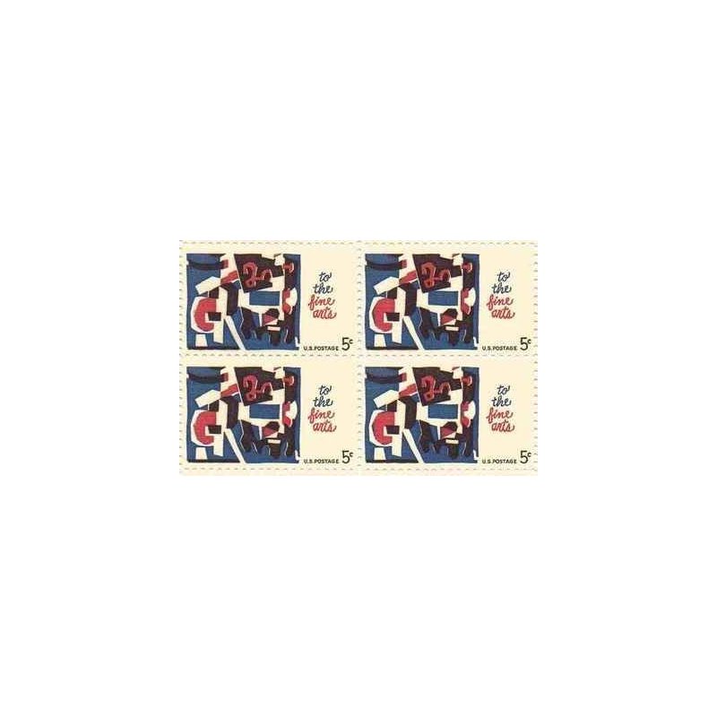 Mint block of four 5-cent US postage stamps honoring the fine arts.