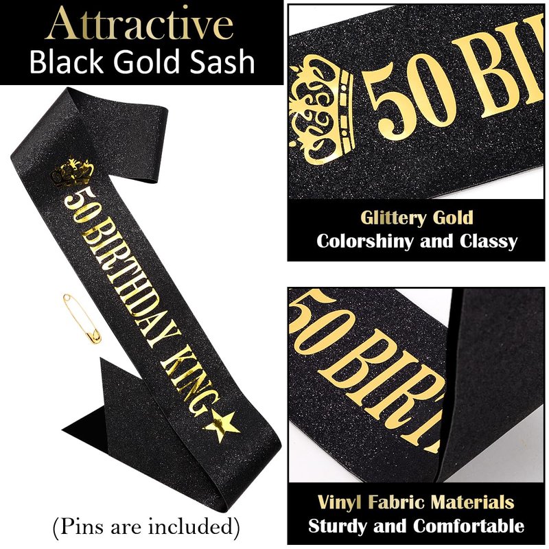 - 🎁50 Birthday King Sash: The sash was very soft and a thick material - not cheap plastic or ribbon. It's a sparkly fabric type material printed with gold foil words, and the glitter can not fall off or go anywhere. Each sash measures 3.82inch wide and total 63inch long, suitable for men and boys. It comes with a safety pin for closure and it can adjust sash to their exact needs.