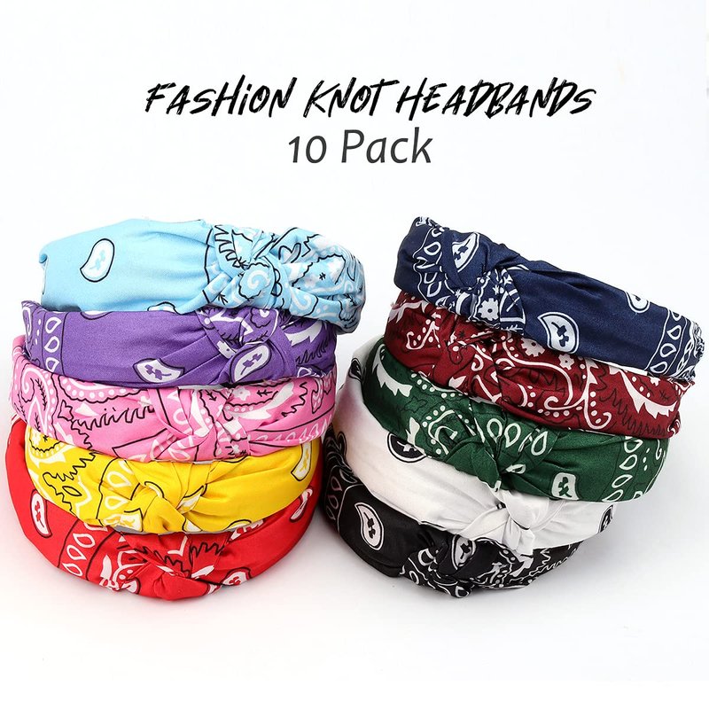 Headbands Set: 10 Pack Paisley Knotted Headband for Women (black, wine red, pink, yellow, blue, sky blue, green, purple, red, white)