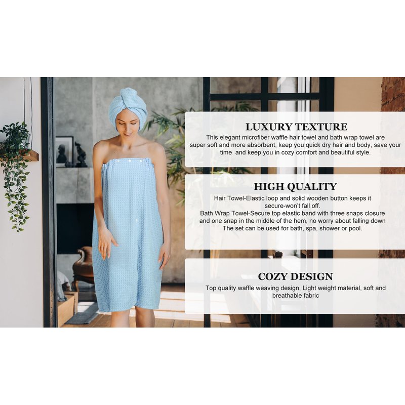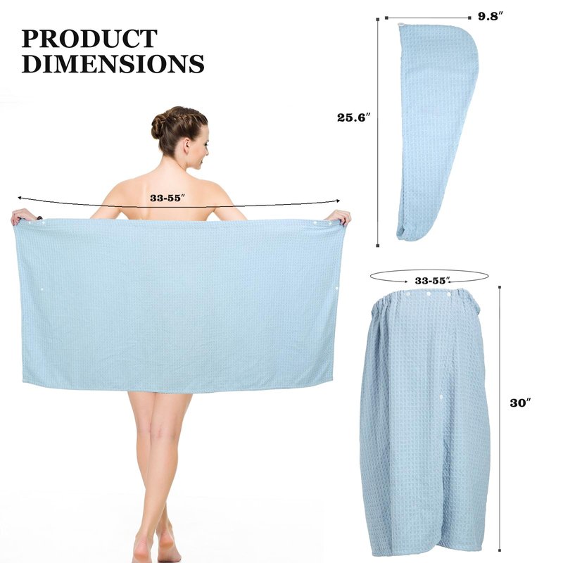 FAST DRYING AND NO DRIPPING – Waffle Bath wrap towel with hair towel are made of super-absorbent microfiber fabric, waffle weaving, machine washable, soft and comfortable, drying your hair and body more quickly and thoroughly, no dripping during your daily use, mainly saving your time. No matter cool or warm day, stay comfortable. SOLID AND SECURE-The elastic loop and solid wooden button on hair towel keeps it secure-won’t fall off. The top elastic band with three snaps closure and one snap in the middle of the hem on the body wrap, no worry about falling down and any accidental exposure. This set is the ideal body and hair towel wrap for women for makeup,skincare,face cleaning,haircare,swimming,yoga, workout,beach, wort at home, etc. ADJUSTABLE - This female shower body around wrap have durable elastic band and three adjustable snaps, one size fits most body type people.The bath wraps could wrap you up completely, and tightly fixed to your body, don't worry about dropping it. KEEP YOUR HAIR AND BODY BE HEALTHIER - Our wearable waffle weave bath wrap towel and hair towel for women are super soft, reducing unnecessary heat by hair dryer or friction to hair and body by ordinary hair towels and bath towels and a great help for a healthier and smoother hair and body. COZY & COMFORTABLE-Microfiber material brings the bath wrap with hair turbans an ultra-soft touch and super absorbent property. Stay warm and cozy in the premium waffle weave body and hair wrap. Lightweight and compact design keep you can wear it everywhere and comfortable and warm all day long.