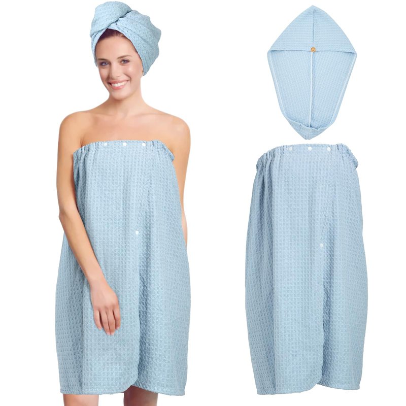 TOCOHO Microfiber Waffle Weave Hair Towel and Bath Wrap Towel Set for Women- Adjustable Soft Shower Body Wraps with Hair Turban, Super Absorbent to Quick Drying Hair and Body (Light Blue)