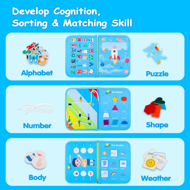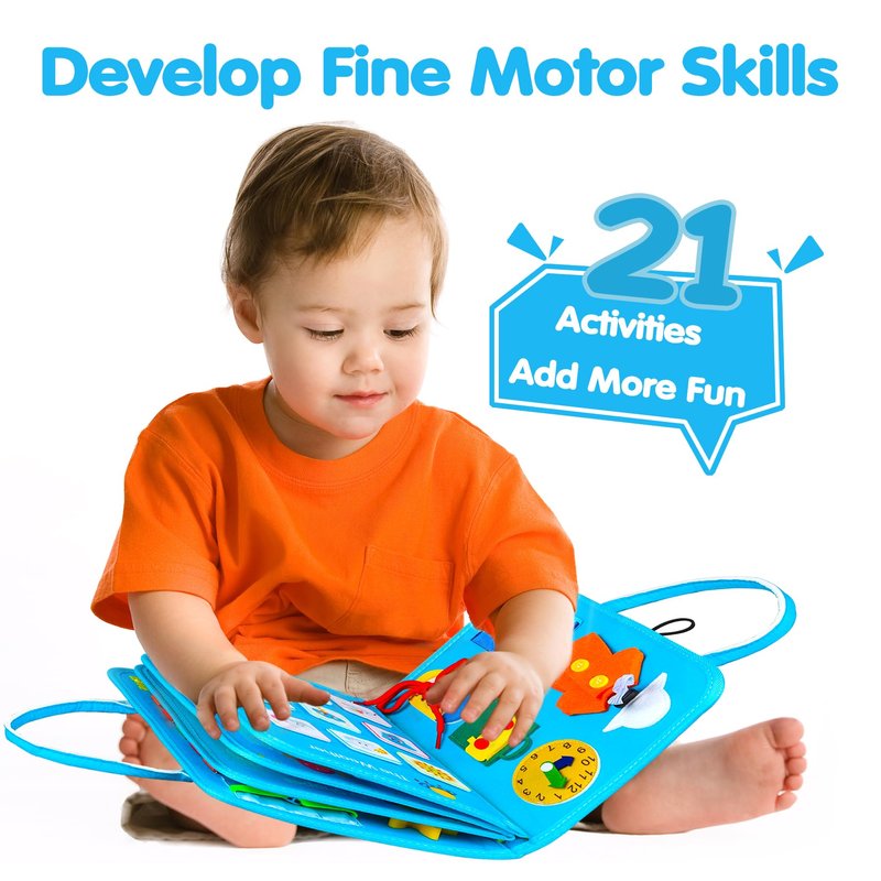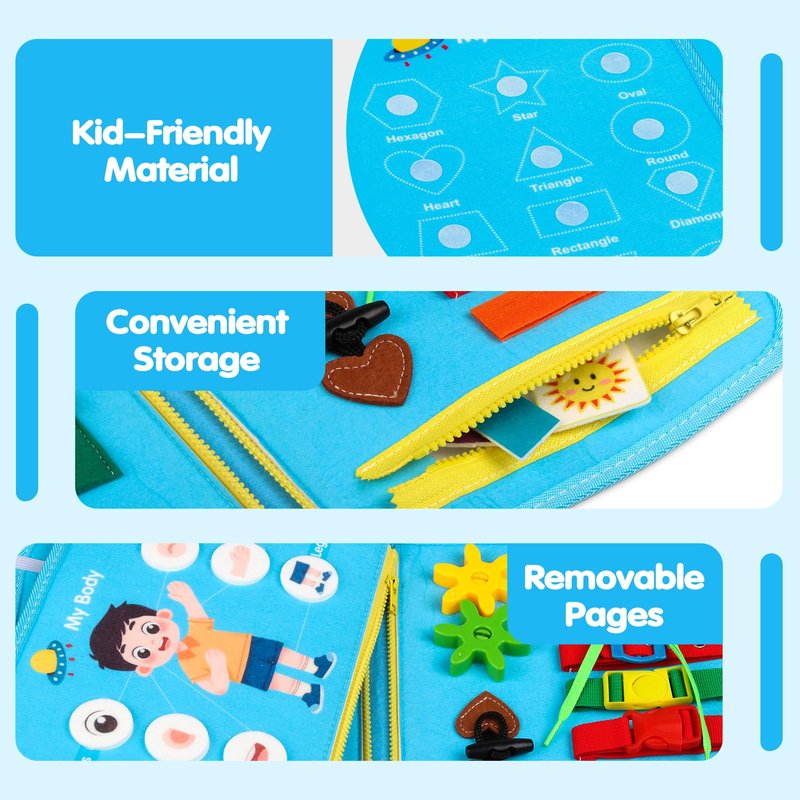 - [Montessori Busy Board]: This Montessori busy board for toddlers offers 8 pages with a diverse range of 21 engaging activities, covering life skills, numbers, letters, shapes, weather, and puzzle learning. Beyond being entertaining, this toy holds significant educational value, aiding toddler in honing their fine motor skills, enhancing hand-eye coordination, fostering problem-solving capabilities, and encouraging sensory exploration.