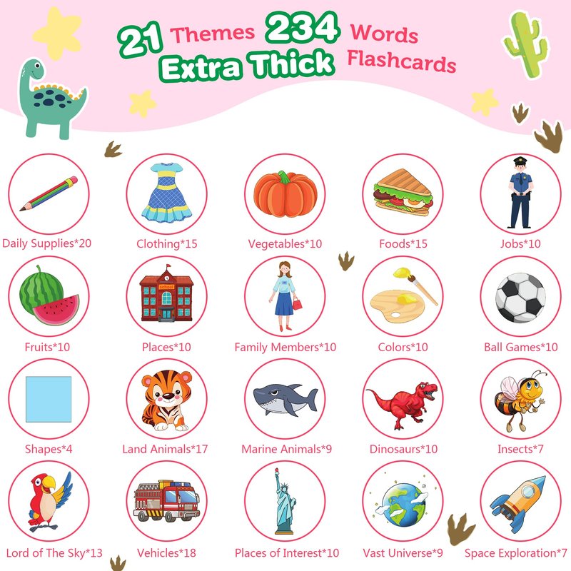 - Toddler Girl Toys: Richgv Pocket Speech for Toddlers contains 117 double-sided flash cards, totaling 234 words. There are 21 different categories, including Daily Supplies, Foods, Family Members, Dinosaurs, Land Animals, Marine Animals, Insects, Vehicles, Places of Interest, and the Vast Universe, etc. This is a great way for toddlers aged 1+ to explore different possibilities, enhance their cognitive ability, exercise their hearing, learn to spell, and expand their vocabulary