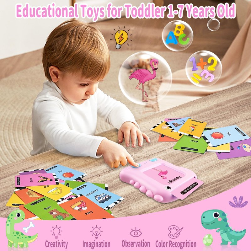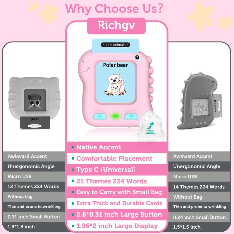 Toddler Girl Toys: Richgv Pocket Speech for Toddlers contains 117 double-sided flash cards, totaling 234 words. There are 21 different categories, including Daily Supplies, Foods, Family Members, Dinosaurs, Land Animals, Marine Animals, Insects, Vehicles, Places of Interest, and the Vast Universe, etc. This is a great way for toddlers aged 1+ to explore different possibilities, enhance their cognitive ability, exercise their hearing, learn to spell, and expand their vocabulary. Turn playtime into learning time Dinosaur Toys for Girls: This cute dino toy set features high-quality audio recordings and colorful, fun graphics that make learning new words an enjoyable experience for kids. It is perfect as sensory toys for toddlers ages 1-3, learning toys for 2 year old, and educational toys for 1 year old. It is also great for preschool learning activities. Not only is it a baby and toddler toy, but it is also like a little speech therapist and a sensory toy for autistic children Easy to Use and Rechargeable: It is easy for toddlers to insert and remove cards, and the reader will tell them what is on the card and what sound the animal or vehicle makes. Its size is perfect for toddler hands and it is easy to carry around, making it an essential travel toy for toddlers aged 1-3. It has a built-in rechargeable battery and is equipped with a Type-C cable. One hour of charging time provides six hours of playing time, and the device will automatically turn off if no operation is performed within 10 minutes Early Learning Starts Here: Richgv Pocket Speech is a fun and educational way for kids to learn English words. It provides your little one with hours of fun exploration and learning while developing their cognitive skills, memory skills, and early reading skills. These simple but fun educational toys are perfect for preschoolers, homeschoolers, and kindergartners. It gets kids away from electronic devices and the TV, protects their eyesight, and helps them learn new word