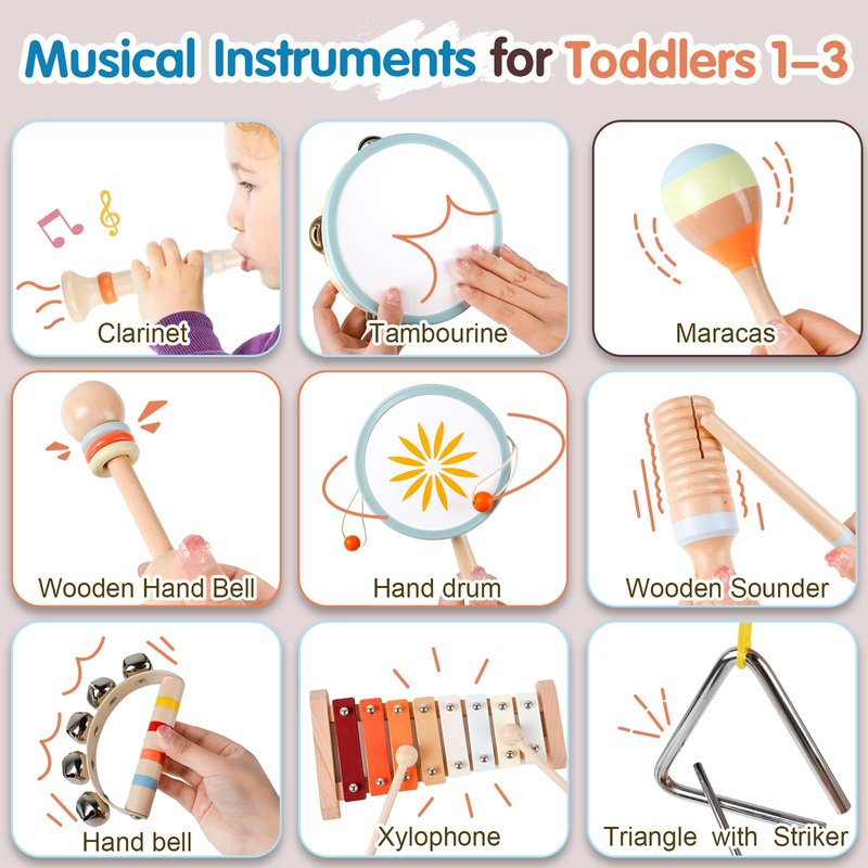 - UPGRADE 9 IN 1 WOODEN MONTESSORI TODDLER MUSICAL INSTRUMENTS SET - Our toddler musical instruments are carefully designed for babies and kids boys girls infant who love wooden montessori educational toys for toddlers 1-3. This baby musical instruments set includes 1 xylophone,1 maracas, 1 hand drum, 1 tambourine, 1 hand bell, 1 clarinet, 1 wooden hand bell, 1 wooden sounder, and 1 triangle with striker. The musical instruments for toddlers 1-3 is perfect toddler educational learning toys for 1-3 year old |12-18 months.